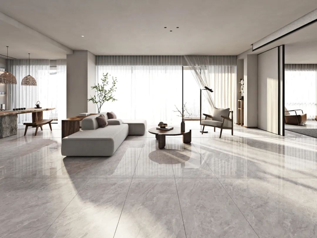 纹理似磅礴山河的克勒斯灰,无限连纹设计让视觉更连贯统一,搭配朦胧的纱帘,在动与静间唤醒家居活力。